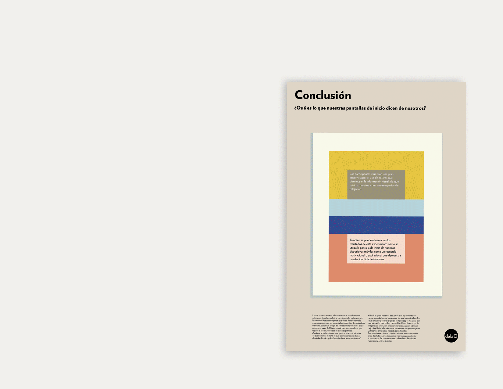 For delaO design studio, it is vital to understand the emotional relationship between technology and Mexican society. For this reason, we continuously design experimental research projects that help us discover and interpret aspects of Mexicans' everyday life and idiosyncrasy. For this project, We collected 183 home screens of various smartphone users to discover any relationship between the perception of color in Mexican society and its use.