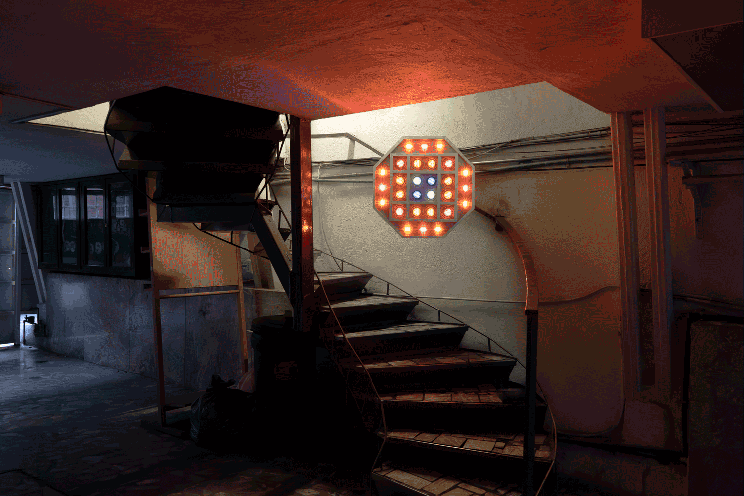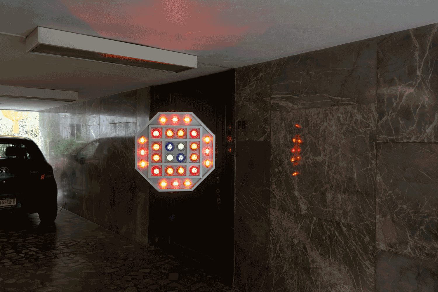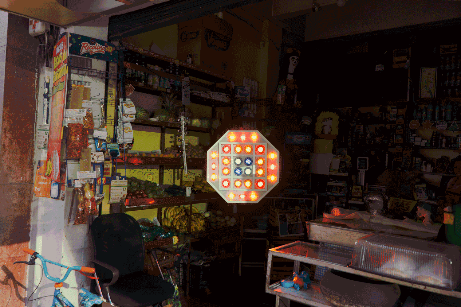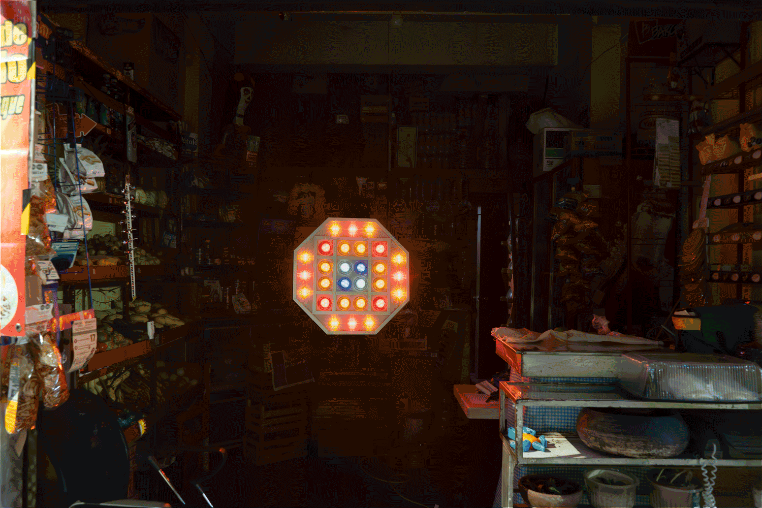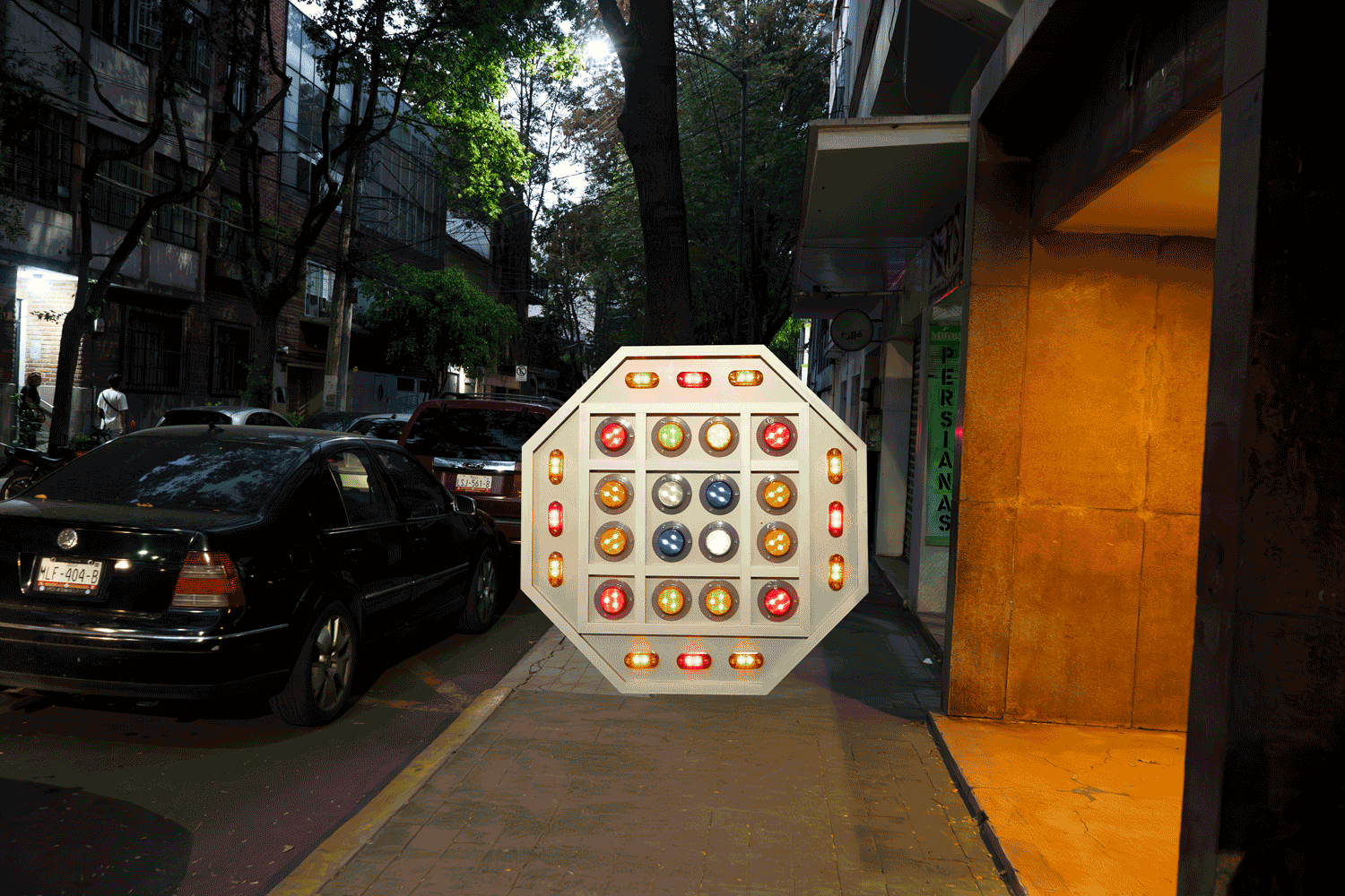 Inspired by the hand-crafted truck bodies seen across Mexico City, this work utilizes aluminum profiles, commercial truck LED lights, and other semi-industrial materials typical of vernacular manufacturing practices. The result is a post-industrial mandala: an asymmetrical lighting object that, when illuminated, recalls the paper lanterns used in rural festivities. Installed in everyday urban contexts, the piece appears to float—like a surreal, unidentified object—generating a tension between the familiar and the uncanny.